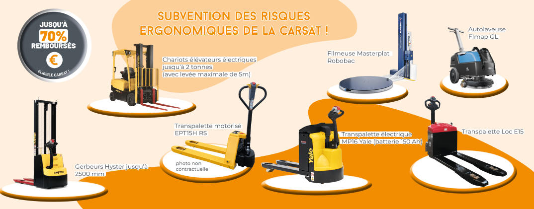 Pour exemple, notre transpalette motorisé EPT15H RS est à 1790€ HT, après réception de la subvention il vous reviendra à 537€ HT.
